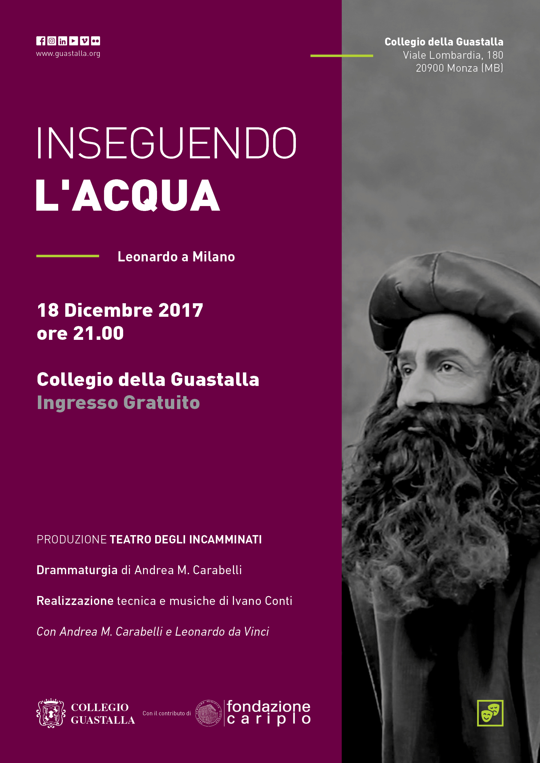 Si tratta di un dialogo surreale tra l’acqua e l’uomo. L’acqua è quella della rete fluviale e lacustre della Lombardia. L’uomo è decisamente fuori dall’ordinario: Leonardo da Vinci.