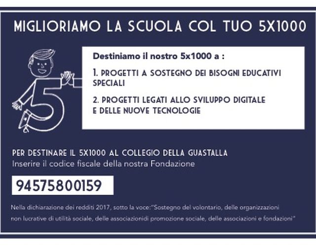 Come tutti gli anni, è possibile destinare nella dichiarazione dei redditi 2017 il 5x1000 alla Fondazione Opere Educative, ente morale che ha la titolarità del Collegio della Guastalla. In particolare, quest'anno i contributi verranno destinati a due tipologie di iniziative: progetti a sostegno dei bisogni educativi speciali e progetti legati allo sviluppo digitale e delle nuove tecnologie. Un contributo per sostenere concretamente la nostra opera educativa.