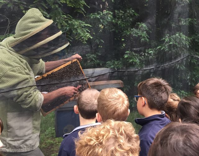 Inizialmente i bambini hanno ascoltato con attenzione la spiegazione sulla vita delle api, poi, con coraggio, sono andati a vederle più da vicino.