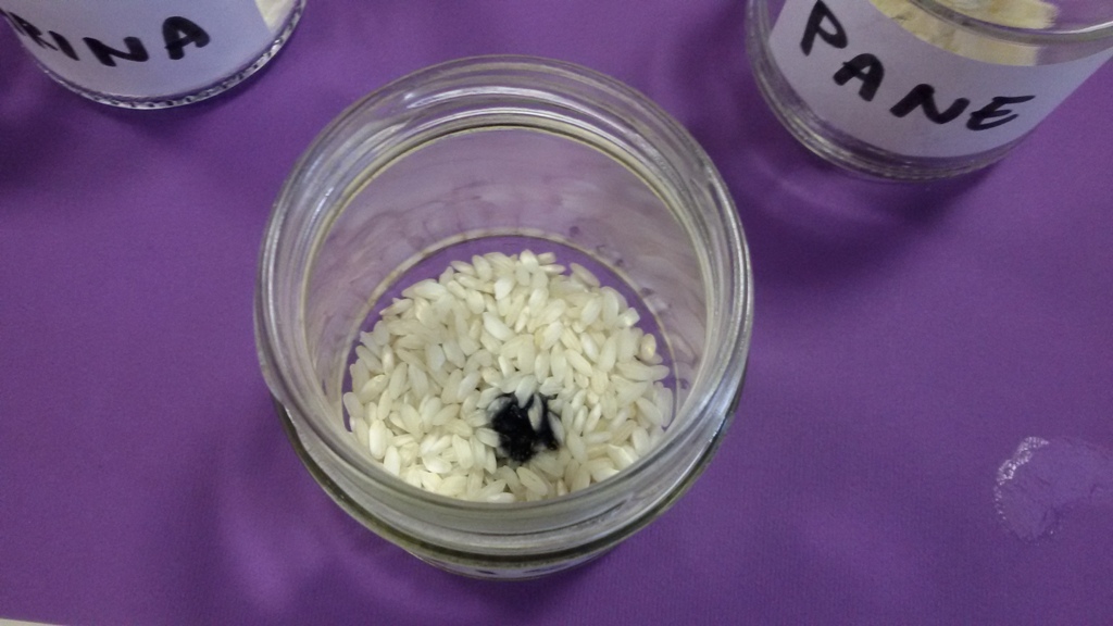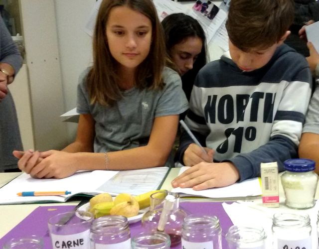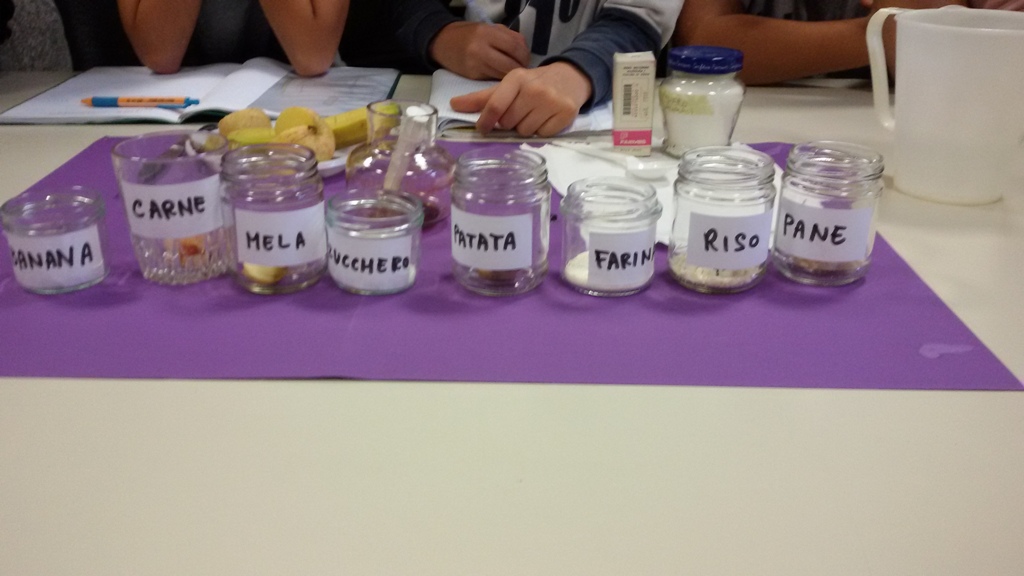 Nella prima esperienza, i ragazzi hanno cercato prove della presenza di amido tra otto alimenti selezionati: farina, zucchero, pane, carne, banana, mela, riso, patata. Poche gocce di una soluzione di tintura di iodio e acqua hanno messo in evidenza la presenza di amido in alcuni di questi alimenti, confermando o smentendo le ipotesi iniziali degli alunni.