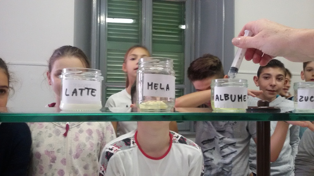 Nella seconda esperienza, gli alunni hanno cercato in quali alimenti si trovassero le proteine. Alcune gocce di acido nitrico posate su albume d’uovo, latte, mela, carne, zucchero hanno svelato la presenza delle proteine che, al contatto con l’acido, si sono denaturate facendo apparire l’alimento come fosse cotto.