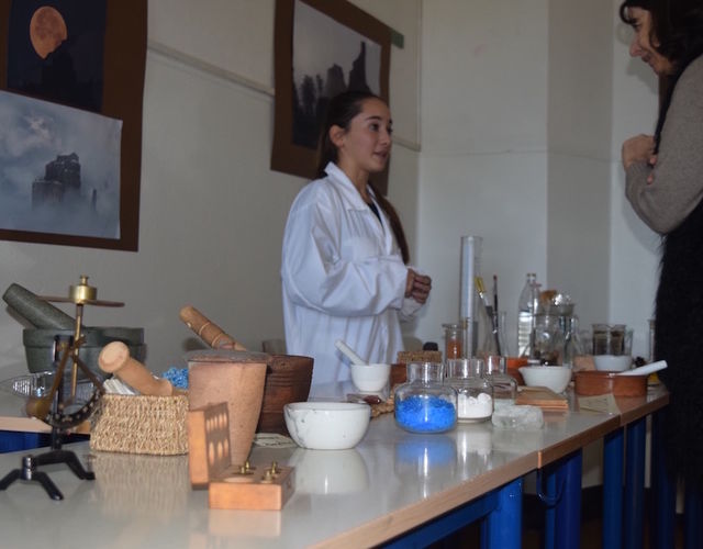 Alcuni studenti hanno spiegato le varie tecniche, apprese nei primi due mesi di lezioni in laboratorio, per realizzare gli inchiostri al carbone e ferrogallico con cui si scriveva in epoca medioevale e illustrato le varie fasi della produzione di pigmenti colorati da materiali organici e inorganici: l’oltremarino naturale dal lapislazzuli, il cinabro, la terra verde, il sangue di drago, l’ocra gialla, la malachite, l’azzurrite, il verdigris, ecc...