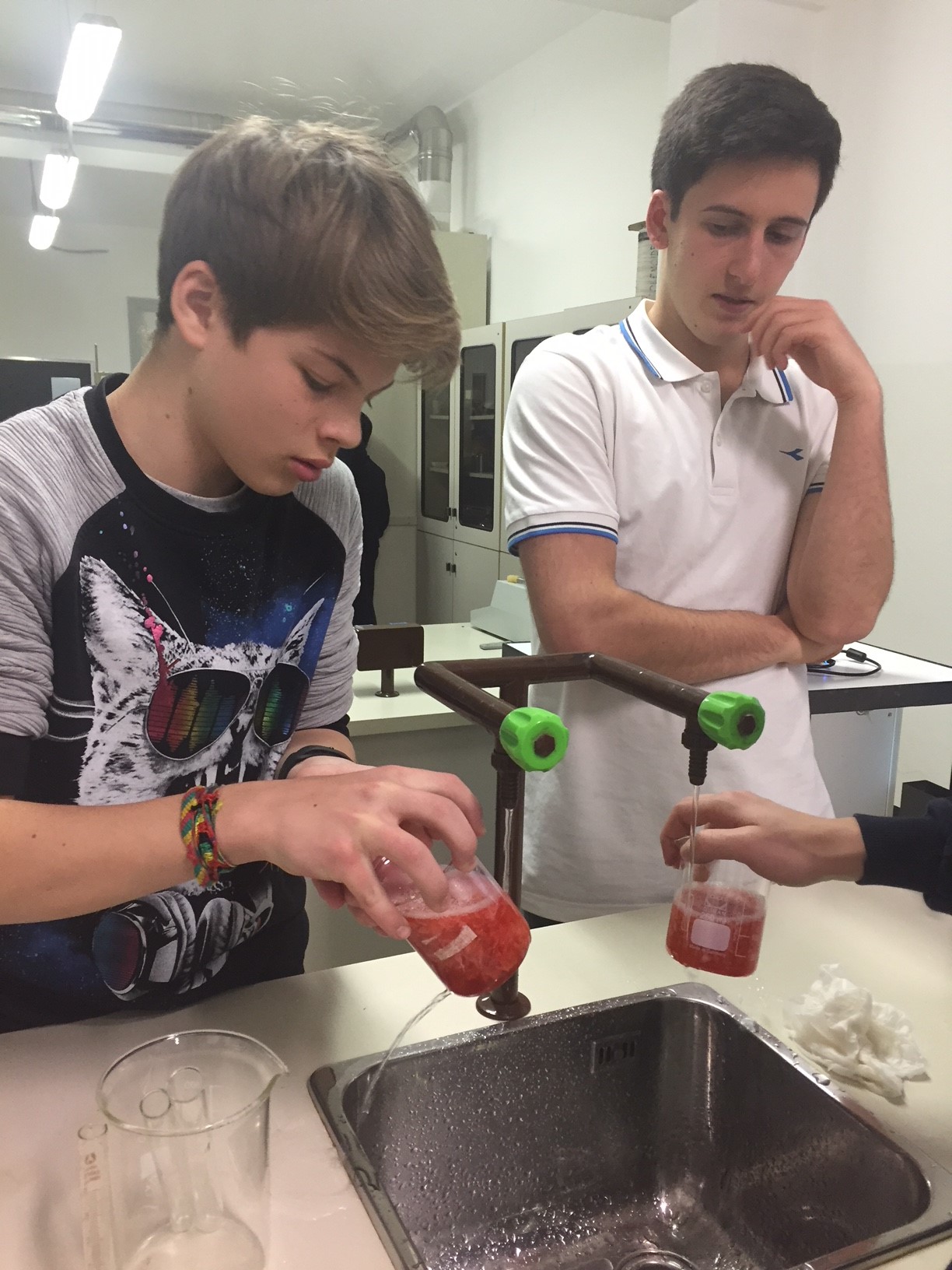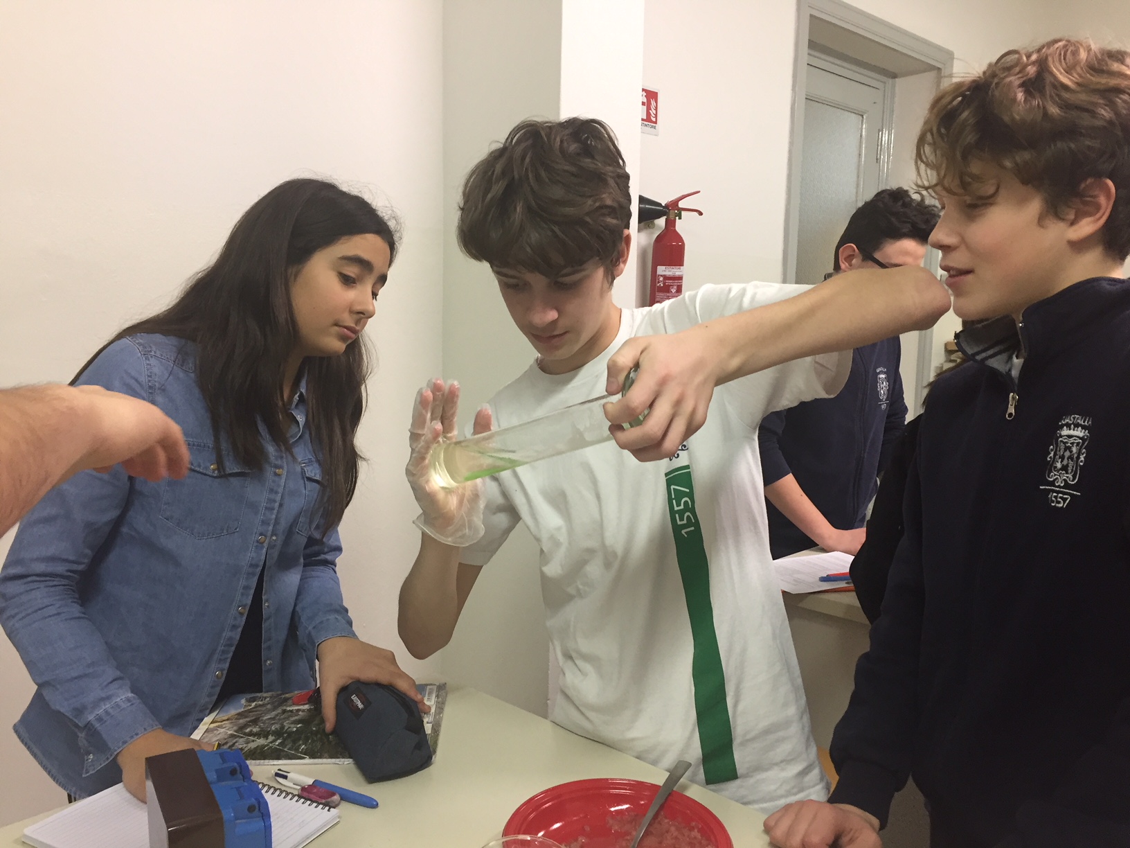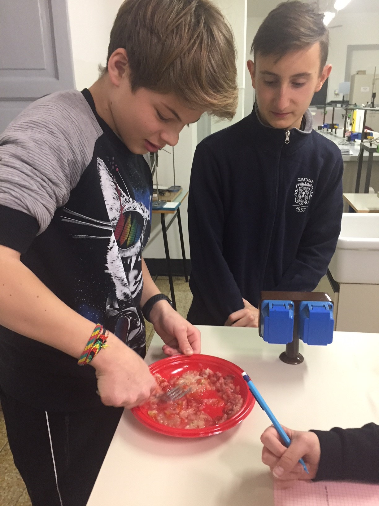 Dopo la loro visita al CusMiBio di Milano, i ragazzi di terza Liceo hanno guidato i compagni di terza Media nell’estrazione del DNA da cellule vegetali di fragola, alternando momenti sperimentali ad approfondimenti teorici sull’argomento.