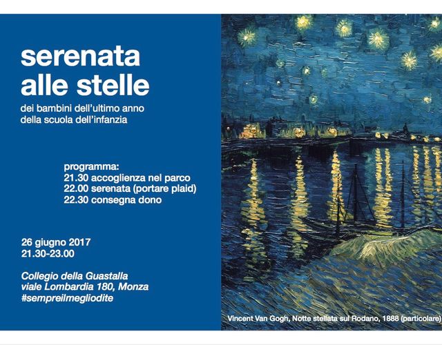 Questa sera a partire dalle 21.30 nella meravigliosa cornice del Parco della scuola, le famiglie e i parenti dei bambini dell'ultimo anno della Scuola dell'infanzia sono invitati a "Serenata sotto le stelle", una serata di grande suggestione dedicata all'osservazione delle stelle (portate i plaid!).