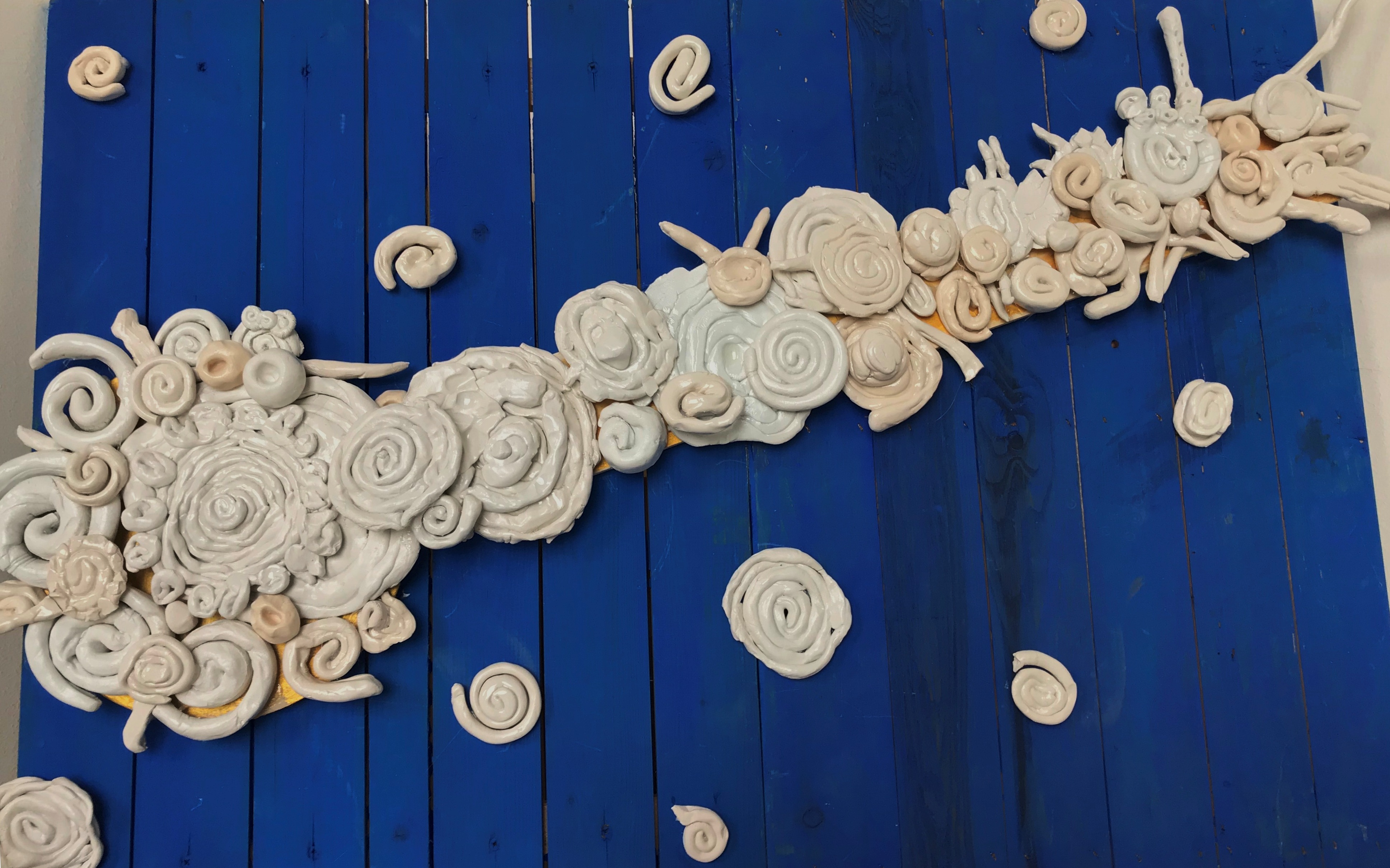 Con l'aiuto del gruppo di Scultura del pomeriggio sono state colorate le cassette della frutta e i pannelli che formano la struttura di tutta l'opera, utilizzando materiali insoliti per ottenere un effetto più materico dell'intero paesaggio: smalti, terre colorate, pigmenti.