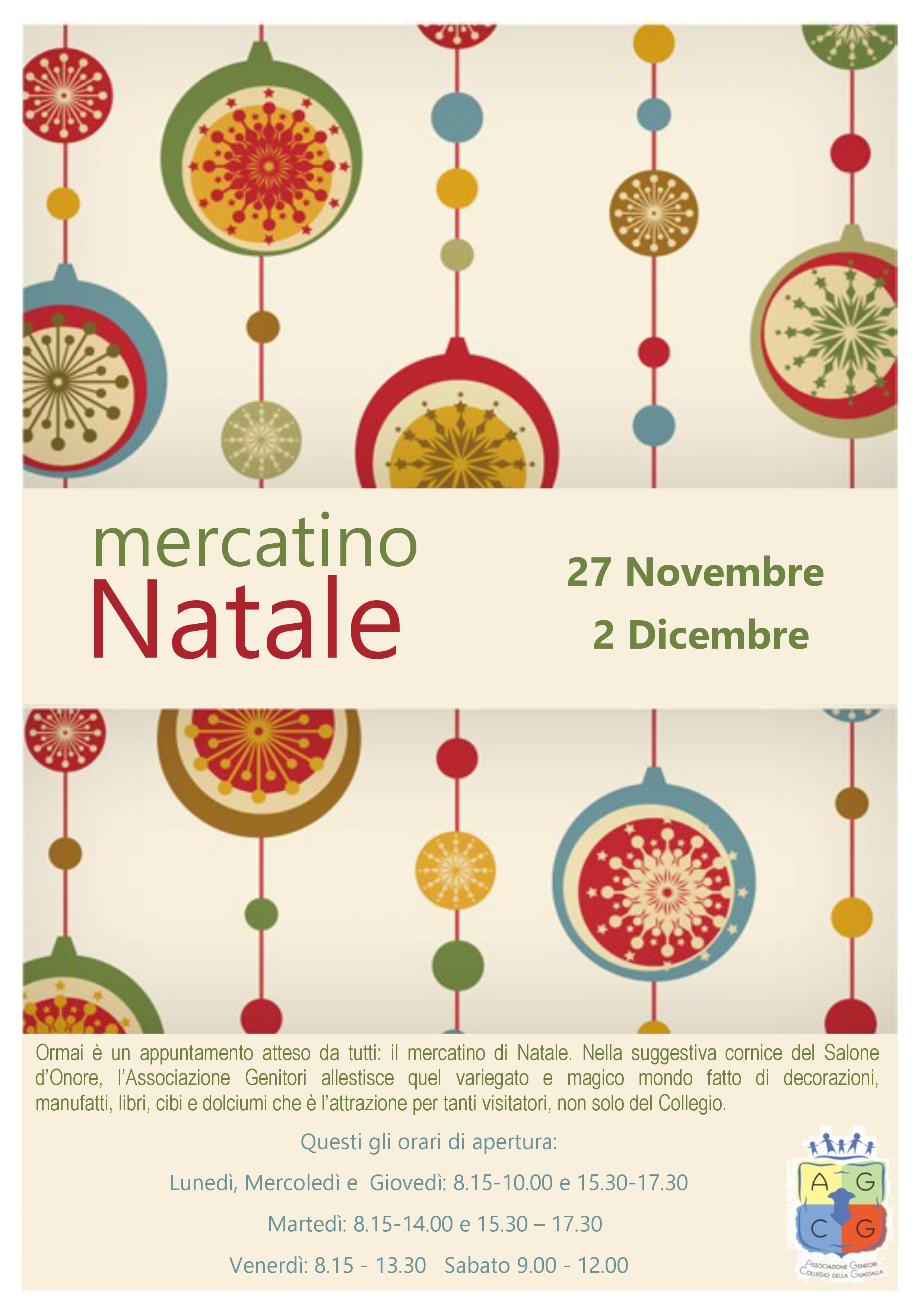 Dal 27 novembre al 2 dicembre ritorna il tradizionale Mercatino di Natale, organizzato dall'Associazione Genitori. Decorazioni, manufatti, libri, cibi e dolciumi sono l’attrazione per tanti visitatori, non solo del Collegio. Nello stesso periodo, si potrà accedere a un piccolo percorso espositivo: "Il Presepe che meraviglia!” - mostra in 18 tappe a cura di Padre Marco Finco e Anna Formaggio.