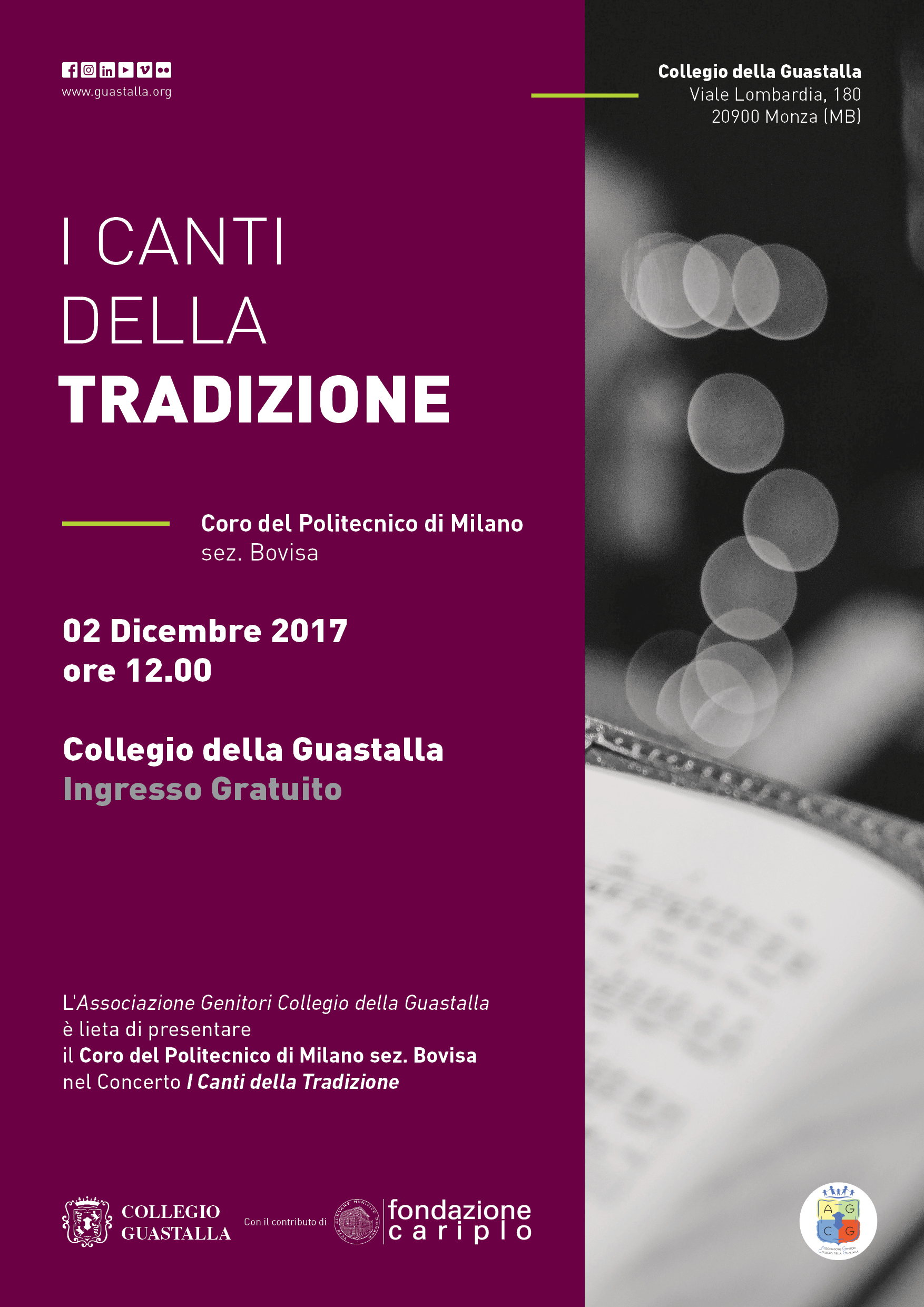 Sabato 2 dicembre alle ore 12, a conclusione del Mercatino, un momento di festa per tutti: il concerto, patrocinato da Fondazione Cariplo, "I canti della tradizione", con il coro del Politecnico di Milano.
