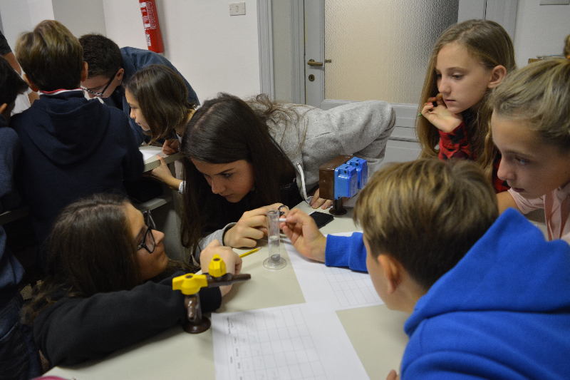 I ragazzi di prima Media e di prima Liceo scientifico, accompagnati dagli insegnanti di Scienze, hanno svolto insieme un laboratorio sulla misura. Gli studenti, organizzati in gruppi “misti”, hanno determinato sperimentalmente il volume di alcuni oggetti e hanno provato a determinare la densità dei materiali.